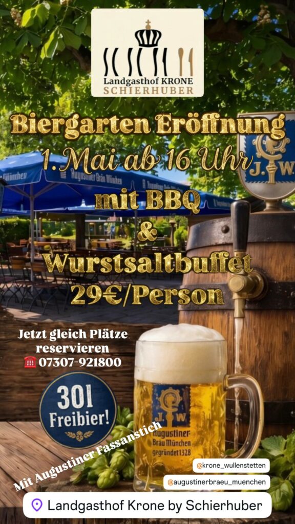 1. Mai Biergarteneröffnung ab 16 Uhr